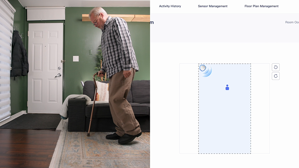 Using an original algorithm and AI, it detects with high accuracy the subject's location, whether the subject has fallen, the amount of activity, and the presence of breathing (under development).