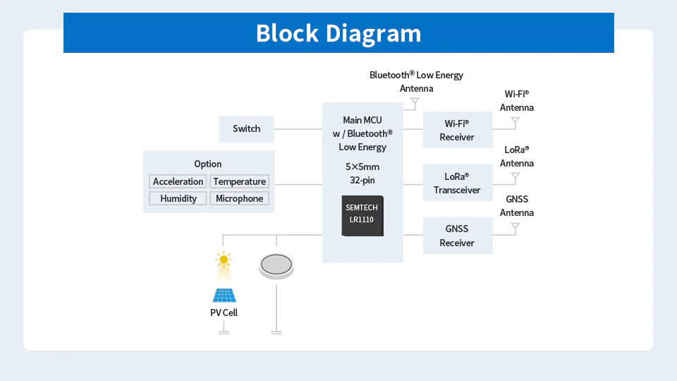 Developed by SMK, this is a LoRaWAN®-compatible tracker with a self-contained power supply. The tracker utilizes energy harvesting technology and is equipped with PV cells and a rechargeable battery. Additionally, it features receivers for LoRaWAN®, GNSS, and Wi-Fi®, allowing for location tracking both indoors and outdoors. For outdoor use, it is designed with weather resistance and waterproofing (IPX7) and can operate even in harsh environments.
