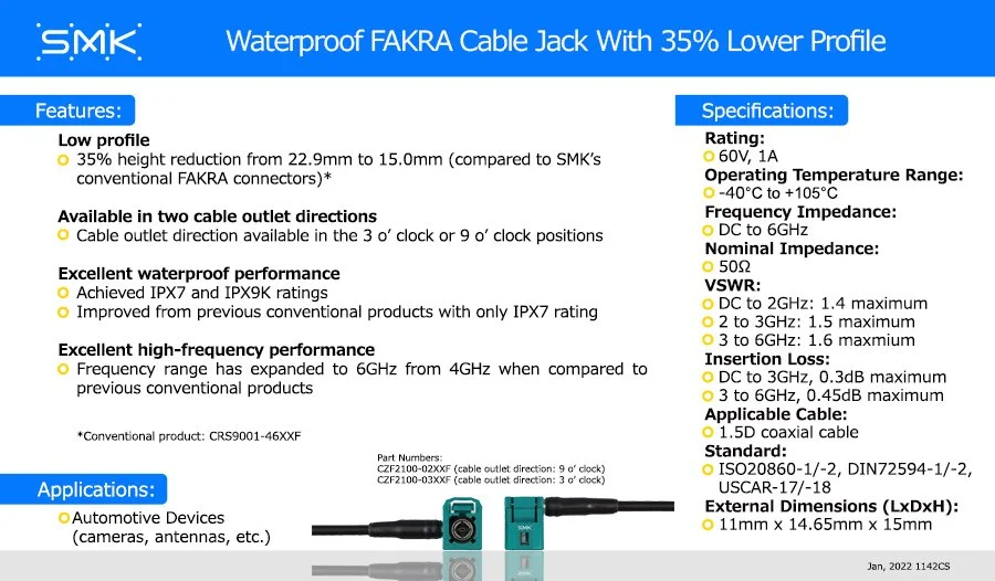 Waterproof FAKRA Cable Jack With 35% Lower Profile SMK EuropeJanuary 24, 2022 Facebook0 Twitter LinkedIn0 0 Likes